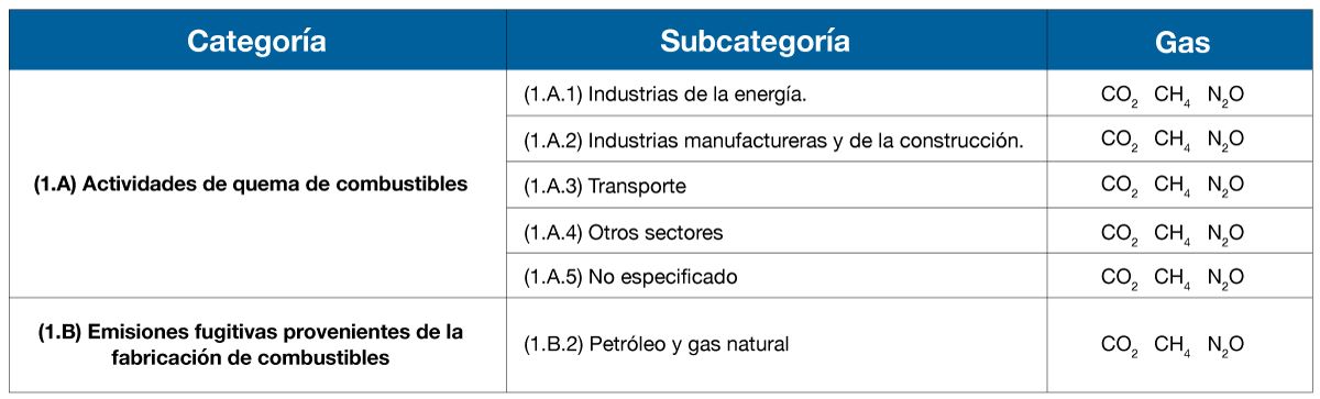 En el sector Energía se analizan las emisiones de dióxido de carbono (CO2 ), metano (CH4 ) y óxido nitroso (N2 O) derivadas del consumo de los combustibles fósiles (1A) y de las emisiones fugitivas provenientes de la extracción, procesamiento y entrega de combustibles (1B) al punto de uso final, las cuales liberan principalmente emisiones de CO2 y CH4 . Las emisiones fugitivas, según el IPCC, son las que se generan en industrias de combustibles sólidos (carbón mineral) e industrias de petróleo y gas. La cantidad de emisiones depende principalmente de la tecnología de procesamiento desde la extracción hasta la comercialización.