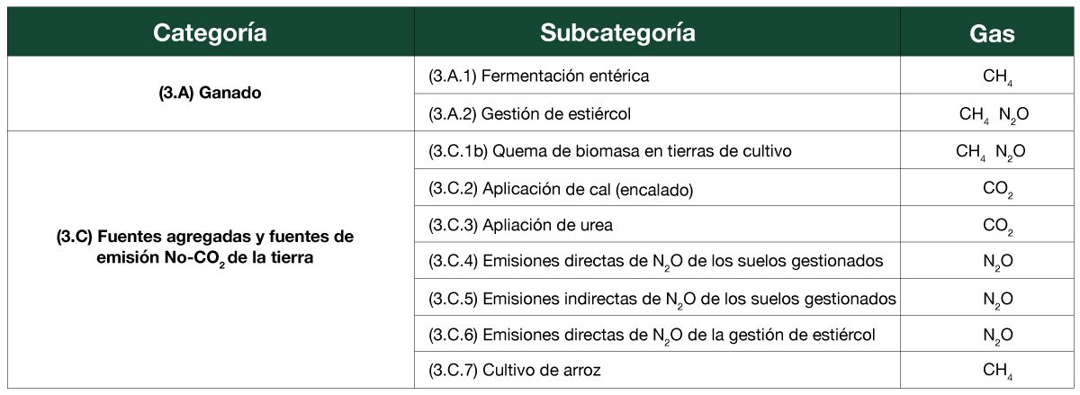 Siguiendo las Directrices del IPCC 2006, para este sector se incluye un análisis separado de las emisiones de gas metano generadas por cultivo de arroz considerando la particularidad de ser un cultivo bajo tierra inundada o con regímenes de agua de niveles altos.