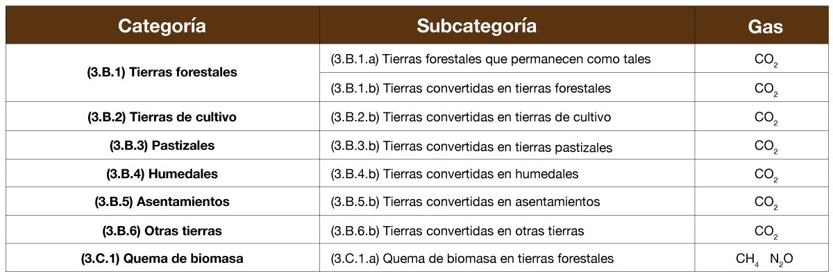 En el sector Uso de la Tierra, Cambio de Uso de la Tierra y Silvicultura (UTCUTS) se analizan las emisiones de dióxido de carbono (CO 2 ), metano (CH 4) y óxido nitroso (N2O), así como también las absorciones de CO₂, generadas por las categorías de Tierras forestales (3B1), Tierras de cultivo (3B2), Pastizales (3B3), Humedales (3B4), Asentamientos (3B5), Otras tierras (3B6) y Quema de biomasa (3C1).