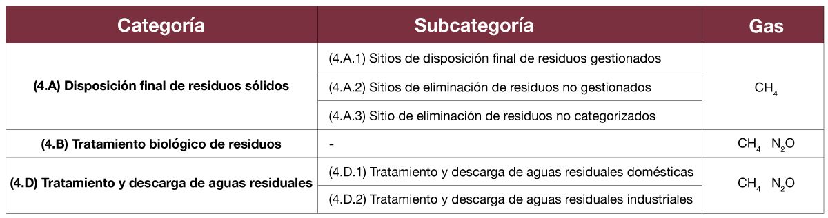 En el sector Residuos se realiza la cuantificación de emisiones de metano (CH4) producidas por la descomposición anaeróbica microbiana de la materia orgánica en sitios de Disposición final de residuos sólidos (4A) y durante el Tratamiento biológico de los residuos sólidos (4B).